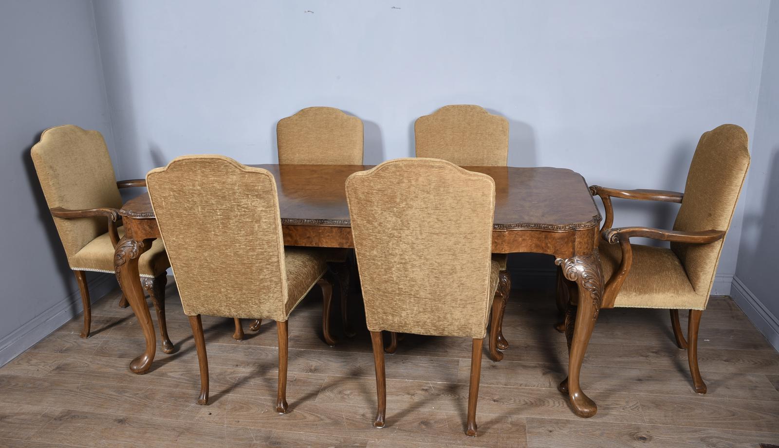 Fine Quality bur walnut Queen Anne style dining suite consisting of table six chairs serving table and sideboard .