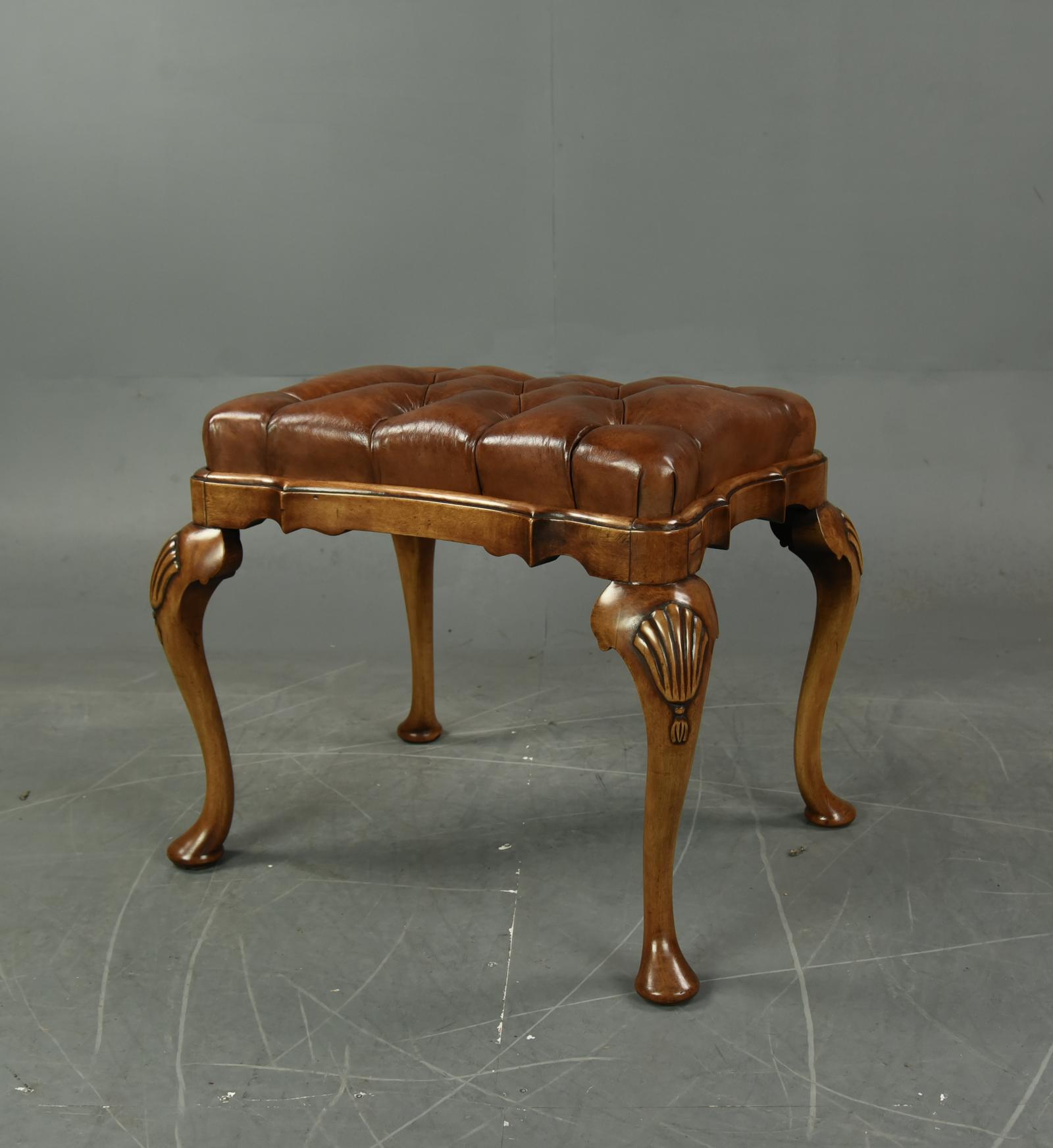 This is a wonderful 'Queen Anne style' walnut stool that has very elegant Queen Anne style legs with carved shell knees. The stool has a deep buttoned hand dyed leather drop seat. The stool is very sturdy with no loose joints and in great clean condition ready for its new home.